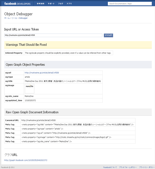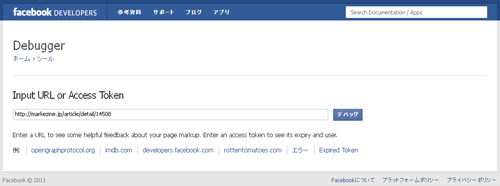 「Facebook開発者」ページのツール「Debugger」で、Open Graph Tagsが正しく設定できているか確認することができます。