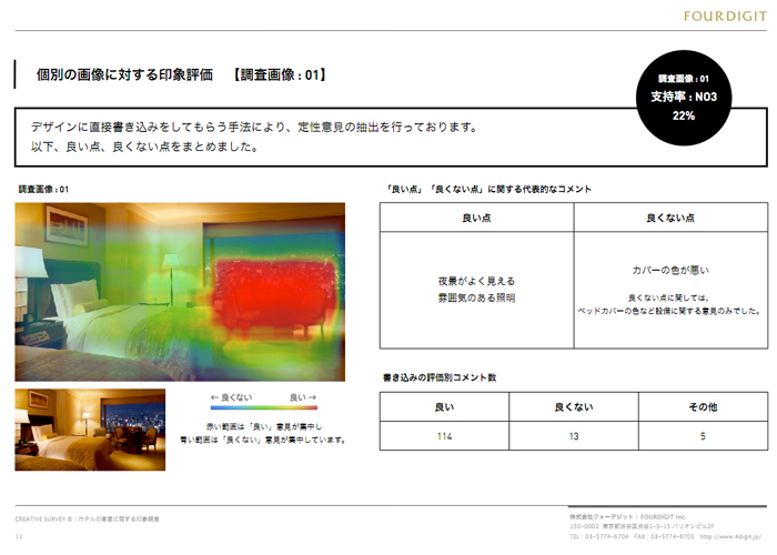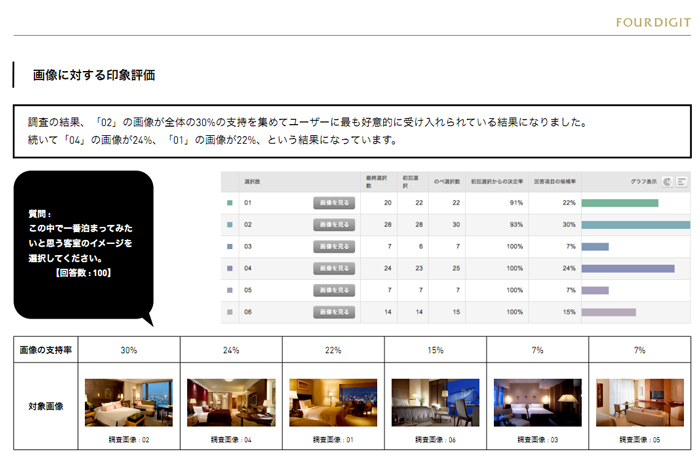 弊社にて調査した結果によると、ホテルの客室画像は、寒色系よりも暖色系が好まれることが分かっています。さらに、画像で見た時は、夜景よりも広さを重視していること、景観が望めない場合にカーテンが閉めてあったりすると評価が下がること、などが分かりました。写真調査は6つのホテルにて調査しましたが、支持された写真はされなかった写真と比べ、結果に4倍以上の差がついています。