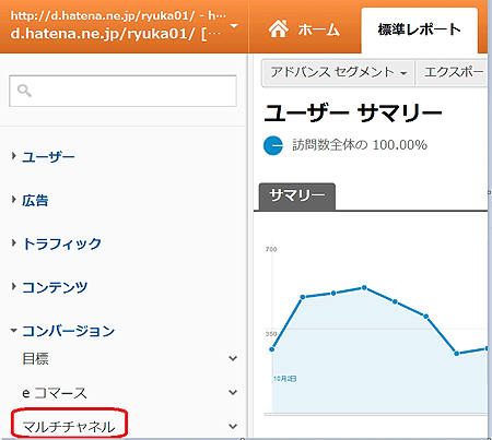 まず、マルチチャネルのレポートのありかですが、新しいGoogle アナリティクスでしか利用ができません。場所は、「標準レポート>コンバージョン>マルチチャネル」になります。