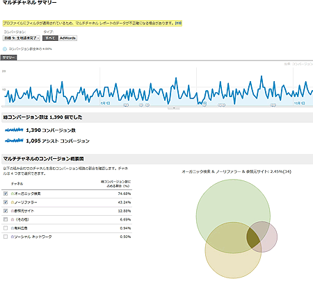 アシストコンバージョンの比率が低いほど、初回訪問でコンバージョンする可能性が高いことを意味しています。では、下半分も確認してみましょう。「マルチチャネルのコンバージョン概要図」というものがあります。そして右側にはベン図があります。どの流入元の組み合わせで成果にたどりついたかがわかるのがこの図です。下の図をみてみましょう。