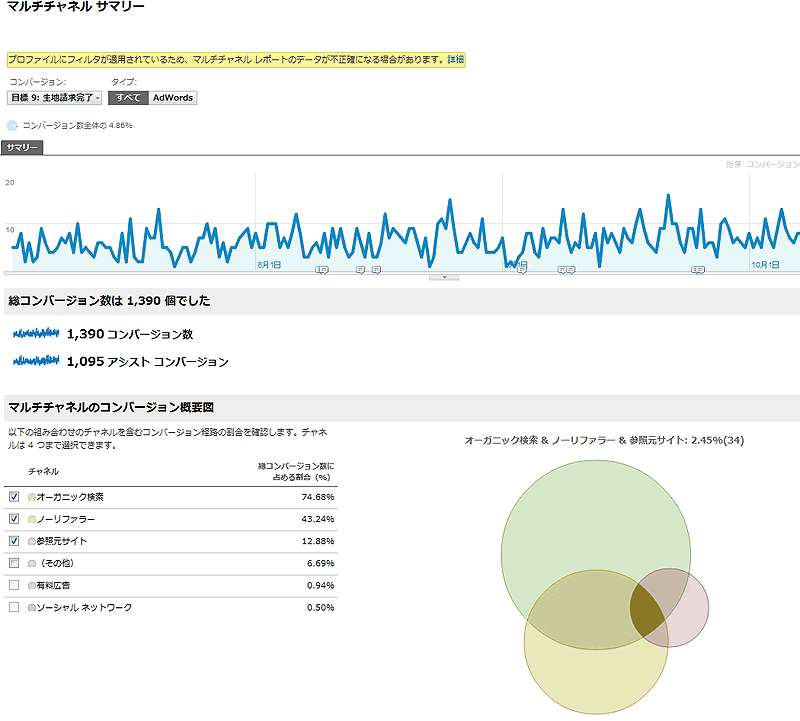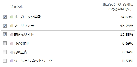 例えば「オーガニック検索」であれば、このサイトでコンバージョンした人の約75%は、一度以上検索エンジンから流入した事を意味しています。