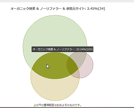 マウスオーバーをすると、組み合わせとその回数を確認できます。今、マウスオーバーされている部分では「オーガニック検索&ノーリファラー 23.24%(323)」と書かれています。これは、「オーガニック検索」と「ノーリファラー」を併用して成果にたどり着いた人が、全成果の23.24%あり、その回数は323回であることをあらわしています。