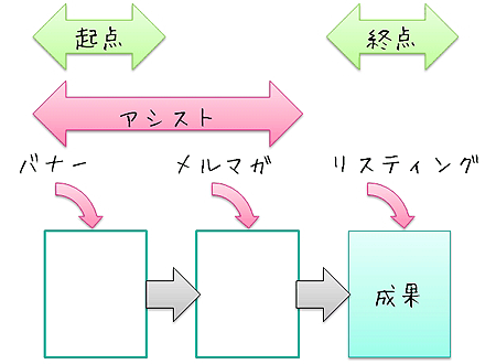 • アシスト:成果に直接繋がった流入元以外の流入元。上記の場合は「バナー」と「メルマガ」。