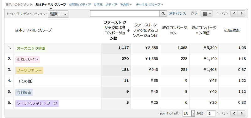 • ファーストクリックによるコンバージョン値:コンバージョン値を設定している場合、起点の回数×1コンバージョンあたりのコンバージョン値の金額を表示。