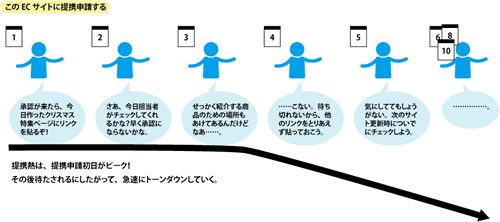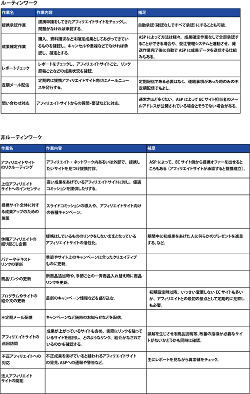 また、開始した後の運用オペレーションも事前にきちんと決めておきましょう。成果承認作業などは他部署との連携を要する場合もありますし、単純作業であればアルバイトへの作業委託も検討する必要があります。提携申請や成果の承認作業、新しい特集など始まった時のリンク素材追加登録、提携アフィリエイトサイト向けメールニュースの発行など、やることは結構たくさんありますので。