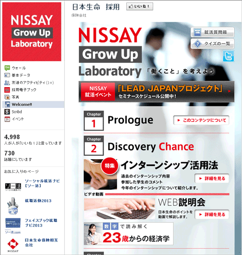本記事執筆現在、Facebook採用ページのなかで、もっとも多く「いいね!」がついているのは、日本生命です。日本生命は、"誰"の部分で認知度が高いのはもちろん、コンテンツもとても魅力的です。