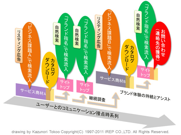 次に「ビジネス課題B」のキーワード検索によるリスティング広告経由で再び来訪し、『サービス商材B』のカタログをダウンロード、最後にブランド指名による自然検索で再来訪し、「お問い合わせ」フォームに個人情報を入力・送信。そのユーザーの連絡先を獲得する成果に至ったというケースがある。(図参照)