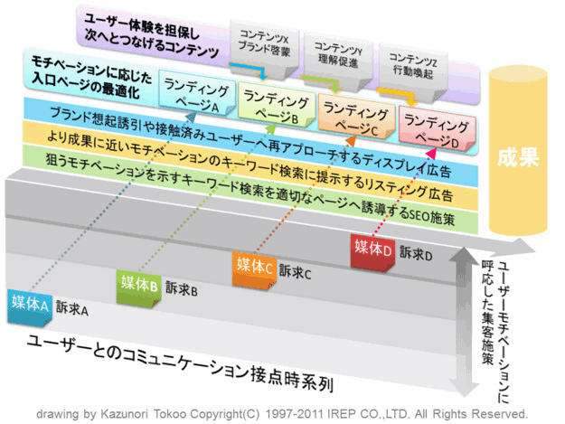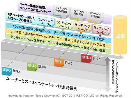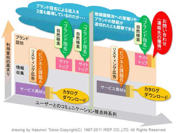 近年のソーシャルメディアにおける企業ページ進出の例を見るまでもなく、ユーザーの選考プロセスの中間、あるいはユーザーがサービスを想起しない段階にアプローチしてブランド訴求する、Web上でのコミュニケーションシナリオの最大公約数を狙った施策設計は、新規の成果対象セグメントを開拓する上で非常に重要である。
