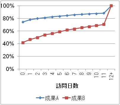 グラフの見方ですが、訪問日数5日の部分をご覧ください。成果Bが60%あたりにあります。これは成果Bの6割は5日以内に行われることを表しています。先程のレポートで取得したデータを単純集計したものです。
