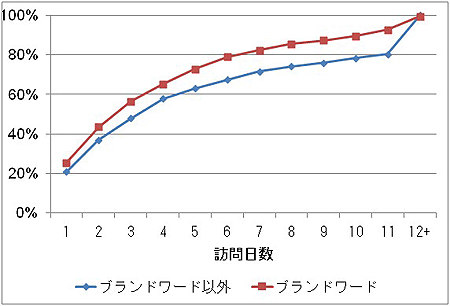 デフォルトで設定しているものを利用することも可能ですし、自分で作成することも可能です。以下のグラフは流入元を「ブランドワード」と「ブランドワード」以外に分けて、コンバージョンまでの日数をプロットしました。