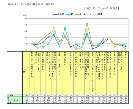 チェックインの理由別に見ると、「自分のいる場所をみんなに知らせたいから」という理由は、「空港」(36.5%)と「テーマパーク」(31.9%)に多く見られました。「暇だったから」という理由は「駅」(34.7%)に多く見られました。「自分の行動記録としてとっておきたい場所だから」という理由は「テーマパーク」(43.0%)のチェックイン理由として、最も高い結果となりました。また「チェックインそのものが楽しいから」は、場所に依存せず、約20%のユーザーのチェックイン理由となっていることがわかりました。
