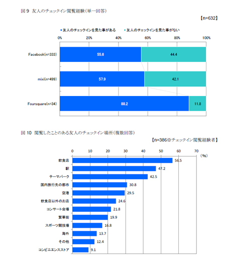 Facebook、mixi、Foursquare利用者に、各ソーシャルメディア上で友人がチェックインしているのを見たことがあるか尋ねたところ、「見たことがある」との回答は、Facebookで55.6%、mixiで57.9%、Foursquareで88.2%と、どれも高い比率で友人のチェックインを閲覧していることがわかりました。