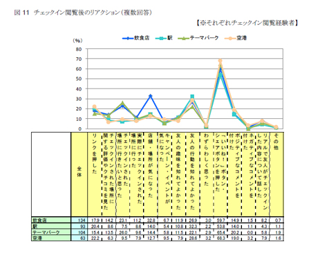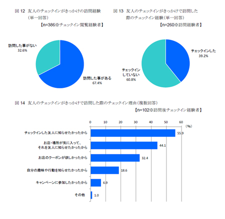 このことから、友人のチェックインを閲覧することで、「いいね!」ボタンなどを押す拡散行動と、「チェックイン対象が気になった」、「行きたいと思った」などチェックイン対象への興味喚起が引き起こされる様子がうかがえます。さらに、チェックイン対象にポジティブな印象を抱きやすくなり、その印象が「いいね!」ボタンなどを通じて、ソーシャルメディア上の友人に広がっていると推察されます。(※「いいね!」ボタンについて、詳しくは下記の調査をご参照ください。)