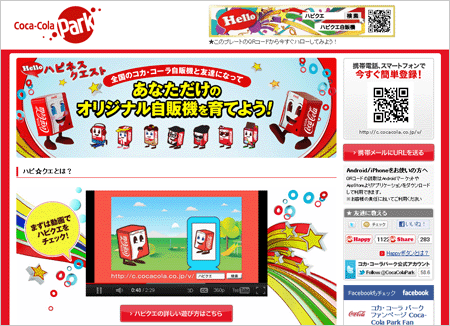 「ハピクエ」は、日本コカ・コーラが2011年12月にスタートしたプロモーションサービスです。このプロモーション用に、全国のコカ・コーラの自販機に名前が付けられました。ユーザーは自販機に貼られたQRコードをきっかけに「ハピクエ」サイトにアクセスし、自販機と友だちになり、アクセスするたびに自販機を育てていくことができます。