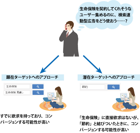 「生命保険」や「生命保険 見直し」などと検索するユーザーは、限りなく顕在ターゲットであるといえます。検索連動型広告からコンバージョンする可能性は、かなり高いでしょう。しかし、それだけで十分でしょうか。