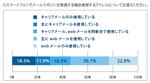 スマートフォンでメールマガジンを受信する場合、使用するメールアドレスについて聞いていますが、スマートフォンユーザーの70%はメールマガジンの受信をWebメール(GmailやYahoo!メール)を利用しています。また半数以上がキャリアで発行されるメールではなく、Webメールを主たるメールアドレスとして利用しています。