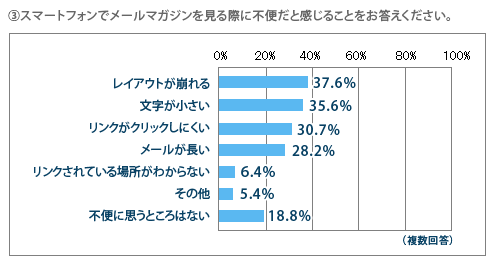メールマガジンにおいてはスマートフォン向けの適応が進んでいないのが現状です。スマートフォンでメールを受信しているメールマガジンを見る際に不便なことについては、「レイアウトが崩れる」「文字が小さい」「クリックがしにくい」などの回答がありました。
