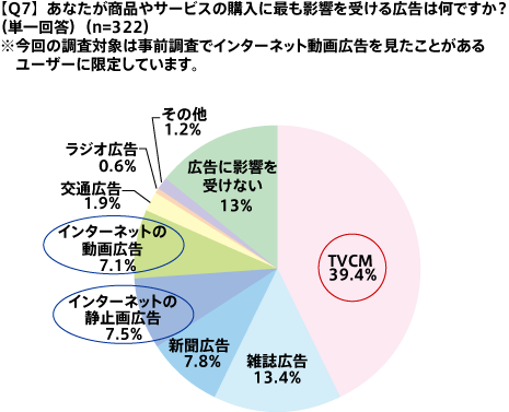 インターネット動画広告への印象や商品購入経験、さらに具体的な購入ジャンルの調査に続いて、次にインターネット動画広告を他のメディアと比較して、そのユーザー認識を探った。Q8で商品やサービスの購入に最も影響を受ける広告は何かを尋ねたところ、「TVCM」が47.5%と他の広告に圧倒的な差をつける結果となった。次いで「雑誌広告」が13.4%、「雑誌広告」が7.8%と続いた。