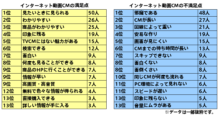 その一方、インターネット(動画)CMに全く興味のないユーザーにとっては、単なる障害物になる恐れがあったり、画像や音量の精度が良くない、PC環境の良し悪しによって見られないなどのマイナス意見も目立った。インターネット(動画)CMは、現時点でまだ発展途上にあると言えるが、今後この調査で分かったユーザーの不満足点をプラスへと転換していくことが、ユーザーのインターネット(動画)CMへの興味・関心を喚起させるきっかけになるのではないだろうか。