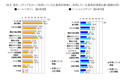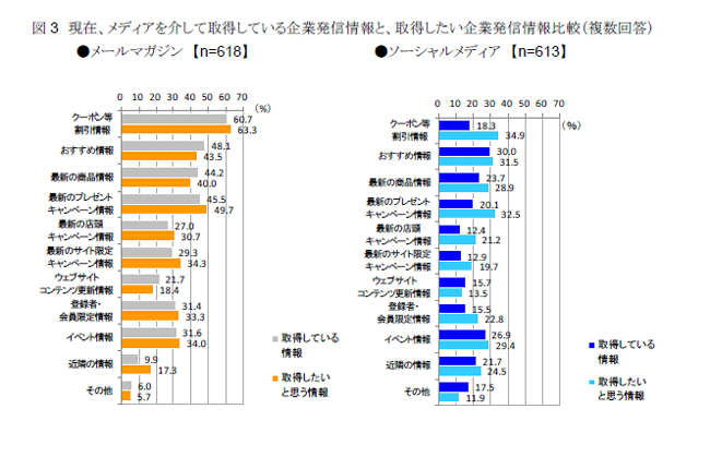 ソーシャルメディアでも「クーポン情報」「おすすめ情報」「キャンペーン情報」に需要はあるが、これらの情報を取得しているユーザーは少ない