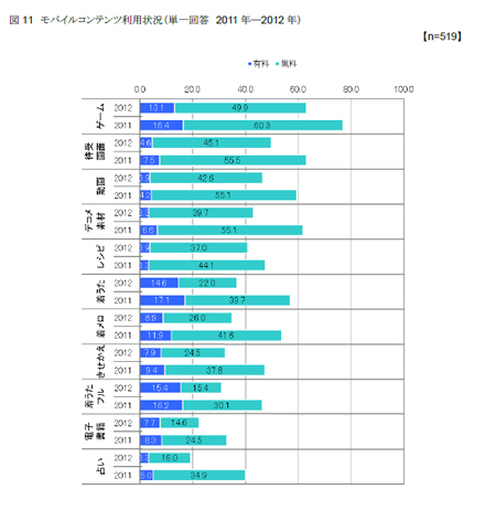 利用しているモバイルコンテンツにおける有料と無料の割合を見てみると、有料コンテンツは「着うたフル」(15%)の利用が最も多く、次いで「着うた」(15%)、「ゲーム」(13%)となりました。昨年と比べると、各コンテンツの利用率は減少していますが、有料コンテンツの利用は大きく減少はしておらず、無料コンテンツ利用率の減少の方が大きいことがわかります。
