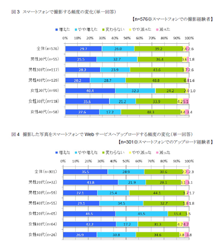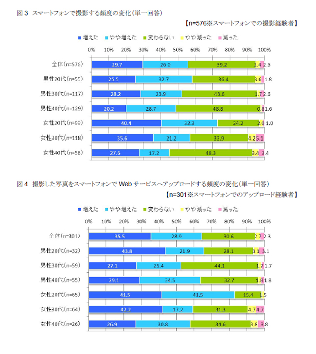 スマートフォンを購入する前に利用していた携帯電話と比べて、スマートフォン購入後にスマートフォンで写真を撮影する頻度、撮影した写真をWebサービス(SNSやブログ、写真共有サービスなど)へアップロードする頻度の変化について尋ねたところ、撮影頻度、アップロード頻度ともに、すべての性年代において約半数以上のユーザーが「増えた」、「やや増えた」と回答しました。