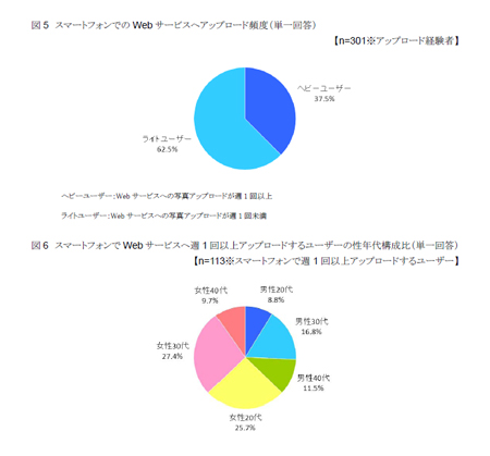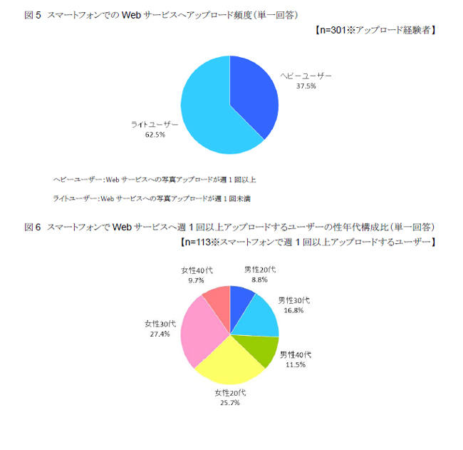 ヘビーユーザーの性年代別の割合は、女性30代(27%)が最も多く、次いで女性20代(26%)と、女性20代、30代が全体の半数を占める結果となり、Webサービスに写真をアップロードする頻度が非常に高いことが伺えます。