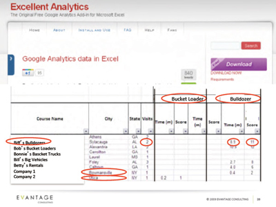 取得したデータは、集計を楽にするため、Google AnalyticsのAPI経由でデータを直接エクセルに落とし込める無料のアドオン「Excellent Analytics」を活用して、会社名と製品名をクロス集計。訪問回数に加えて、スコアリング結果、滞在時間もレポートに加えた。会社名の横には都市名と州も追加。どの都市をターゲットとして広告出稿やイベント開催をすべきか、という判断を営業チームが行えるようにした、という。