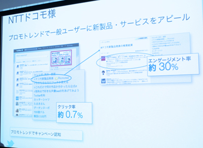 プロモトレンドを日本で初めて実施したNTTドコモは、「#ドコモ新製品発表」というハッシュタグを使い、2011-2012冬春モデルのプロモーションを行った。