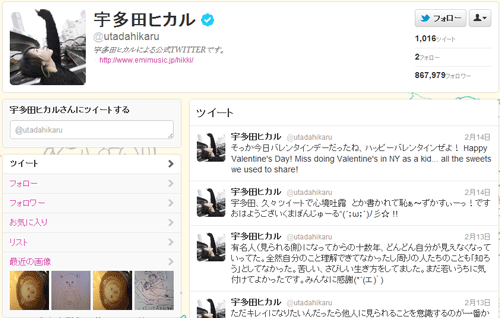 そして何より、本人がネットでのコミュニケーションを楽しんでいる。宇多田ヒカルは2011年末をもってアーティスト活動を一時休止しているが、2010年に開設したTwitterアカウント(@utadahikaru)ではツイートを続けており、現在も86万人にフォローされている。