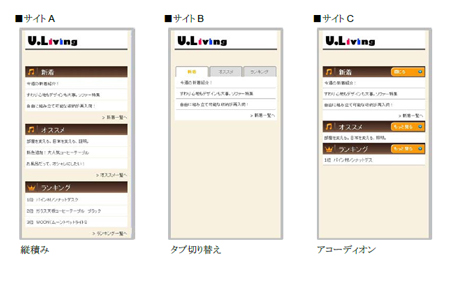 複数コンテンツの表現方法によるユーザー操作印象の変化を調査するため、ユーザーに以下の3パターンのサイトA、B、Cに実際にアクセスしてもらい、使い勝手について「最も良いと思うサイト」を評価してもらいました。