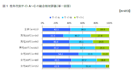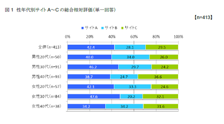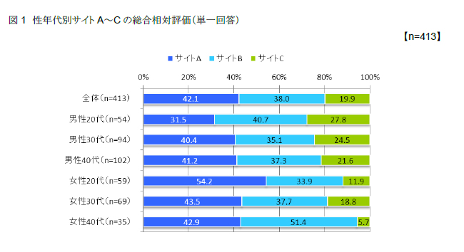 性年代別に見てみると、20代では男性・女性によって支持の差が見られました。20代男性では、サイトB(41%)、サイトC(28%)との回答が全体より上回る結果となりました。一方の20代女性の場合、サイトAが半数以上の支持を得ており、男性とは反対にサイトC(12%)が低い評価となりました。