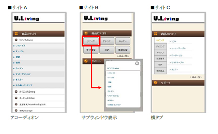 カテゴリ選択の表現方法によるユーザー操作印象の変化を調査するため、ユーザーに以下の3パターンのサイトA、B、Cに実際にアクセスしてもらい、使い勝手について「最も良いと思うサイト」を評価してもらいました。
