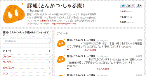 「来店の10%がTwitter経由で、多い時は4割以上がTwitterユーザーの時も」という、Twitterをうまく活用する飲食店として有名な「豚組」の使い方はとても参考になる。Twitter上で予約を受け付けたり、「豚組なう」とユーザーがツイートしたらお礼に1品プレゼントすることがあったり、感想やお礼のやりとりをしたりなどがすべてTwitter上で行われているので、やりとりを見ている人が巻き込み効果で来店するようになるのだ。