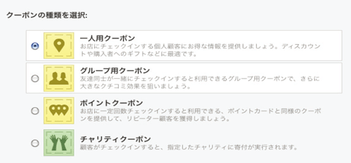 チェックインクーポンには「1人用クーポン」「グループ用クーポン」「ポイントクーポン」「チャリティクーポン」の4種類がある。チェックインクーポンはFacebookにチェックインすることが利用条件なので、Facebook内での拡散も期待できる。店舗やニーズに合わせた使い方をすると効果が実感できるはずだ。