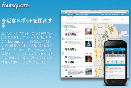 Foursquareは、米国で人気の位置情報サービスだ。店舗などに最も多くチェックインしたユーザーは「メイヤー」の称号がもらえる。この称号がもらえるのは、1つの場所につき1人だけとなる。登録した店舗は、ベニューオーナー、ブランドページオーナーとなり、チェックインに応じて様々な特典を提供し、販促活動を行うことができる。