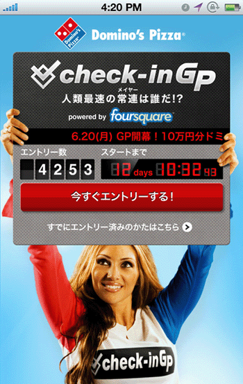 日本でも、ドミノ・ピザジャパンが2011年6月、スマートフォンでの実店舗へのチェックインを競う「check-in GP」を行った。チェックインに応じてポイントが獲得でき、最多ポイント獲得者は商品がもらえるというもので、期間中にチェックインすれば、テイクアウトが5%オフになるクーポンも合わせて提供していた。チェックインによって拡散も期待でき、常連客には特典もプレゼントできるという、エンゲージメントにつながるキャンペーン例といえる。