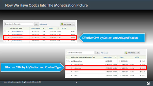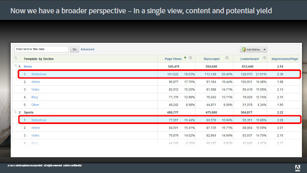 左側にはカテゴリ名(NewsとSports)があり、それがさらに記事の種類(Slideshow、Article、Viedo、Blog、Other)に分かれています。そして右側に表示されているのが、ページビュー、スカイスクレイパー広告、リーダーボード広告と、ページあたりの広告閲覧数((スカイスクレイパー広告+リーダーボード広告÷ページビュー数)になります。