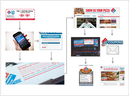 「No dead ends」の例としてドミノピザによる一連の統合型マーケティングコミュニケーションが紹介された。ドミノピザのマーケティングコミュニケーションは次のような設計の元、実施されている。