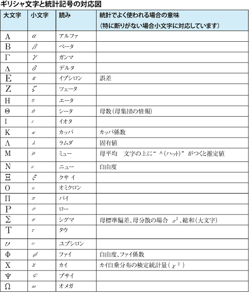 統計を学んでいると、ギリシャ文字がたくさん出てきて、まず文字が読みにくいということがよくあります。慣例ですので絶対のルールではないのですが、一般的に、母分散や母平均などのような母集団の情報(母数と呼びます)には、ギリシャ文字、標本から計算して得られた情報(統計量と呼びます)には、英語のアルファベットを使うことが多いです。