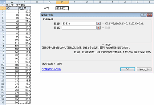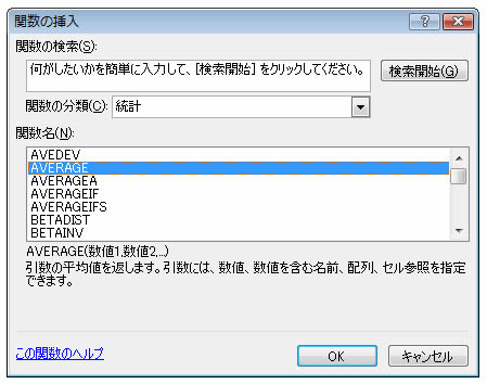 [関数の分類]から[統計]を選び、[AVERAGE]関数を選択します。