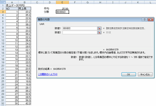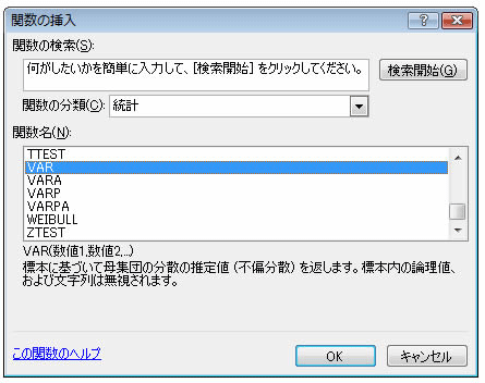 いよいよ分散です。平均同様、[数式]タブの[関数の挿入]をクリックします。 [関数の分類]から[統計]を選び、[VAR]関数を選択します。