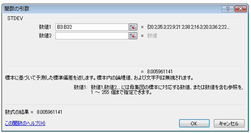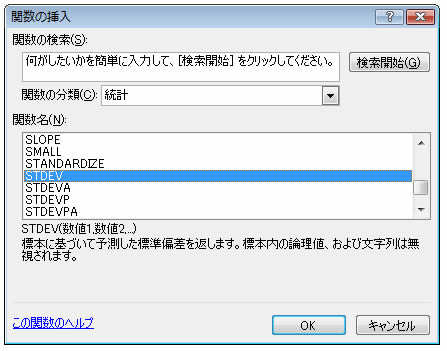 平均同様、[数式]タブの[関数の挿入]をクリックします。[関数の分類]から[統計]を選び、[STDEV]関数を選択します。