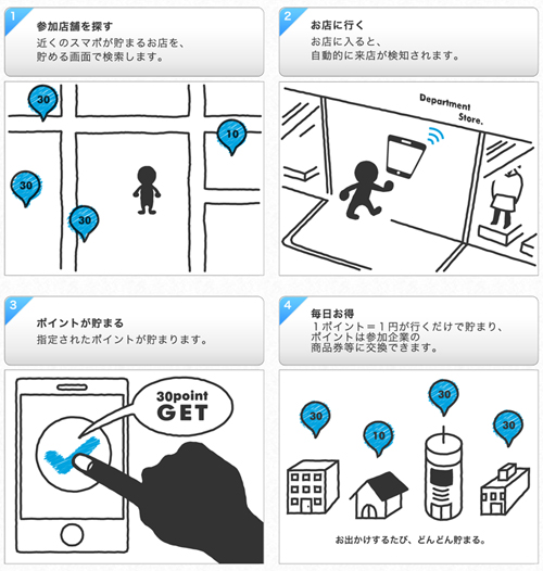 真のチェックインとは、Foresquare(フォースクエア)等が、実際にそのお店に行かなくてもチェックインできてしまう「自己申告制」(またの名を「偽チェックイン」)なのに対して、特別なセンシング技術で、実際に来店していないとチェックインできないようにする仕組みです。