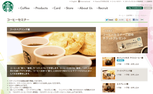 スターバックスジャパンは値引きに頼らないCRM戦略をとっている。その戦略の1つの施策としてコーヒーセミナー「フードペアリング」というコーヒーとの食べ合わせを体験できるイベントを行っている。ワインと同じように、コーヒーも食べ合わせで味が膨らむことを顧客に体験してもらうことで、CRMを築いていく。