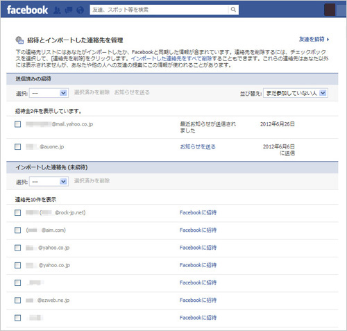 この「招待とインポートした連絡先を管理」では、インポートした連絡先を削除できる。Facebookでつながりになりたくない人や、コンタクトを避けたい人、メーリングリストやブログ投稿のような人以外のメールアドレスは、ここで削除しておくとよいだろう。
