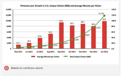 これは米国でのPinterestの伸びを表したグラフで、緑の折れ線グラフが「総ユニークビジター数」の推移を、赤の棒グラフが「1人あたりの平均利用時間」を示しています。わずか10か月で約28倍のUU増となり、右肩上がりの順調な推移が見て取れます。