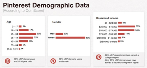 最後に、ユーザー属性を見てみると、25~44歳が半数以上を占めており、男女比は20:80と、やはり圧倒的に女性ユーザーが多いことがわかります。さらに着目したいのが、家計所得のボリュームゾーン。2万5000ドル~7万4999ドルで全体の約7割を占めていることから、“ちょっと背伸びをしたら手が届きそうな、自分の憧れを集めるサイト”としてPinterestが活用されているのではないかと推測されます。