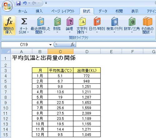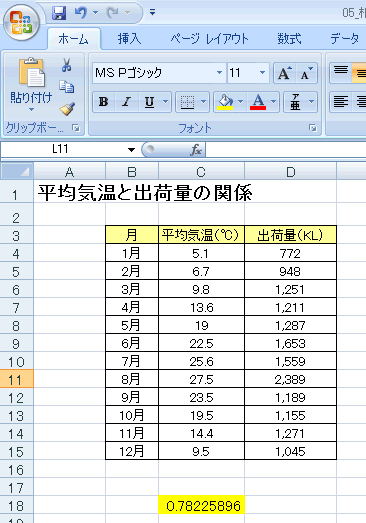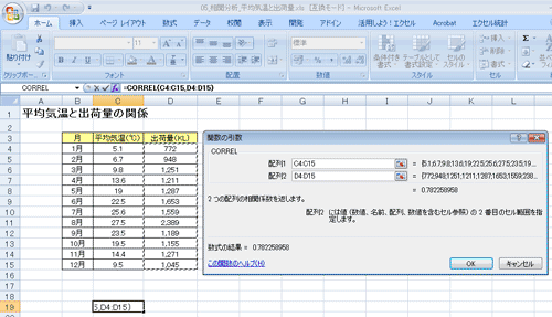 6.相関係数は、「0.782」と計算されました。平均気温とビールの出荷量には「強い正の相関がある」といえます。