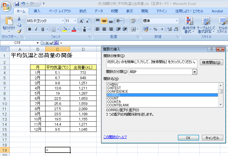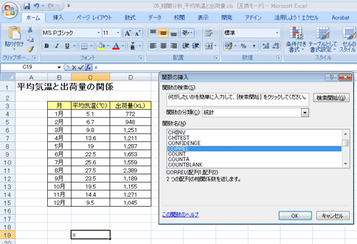 CORREL関数で相関係数を求める